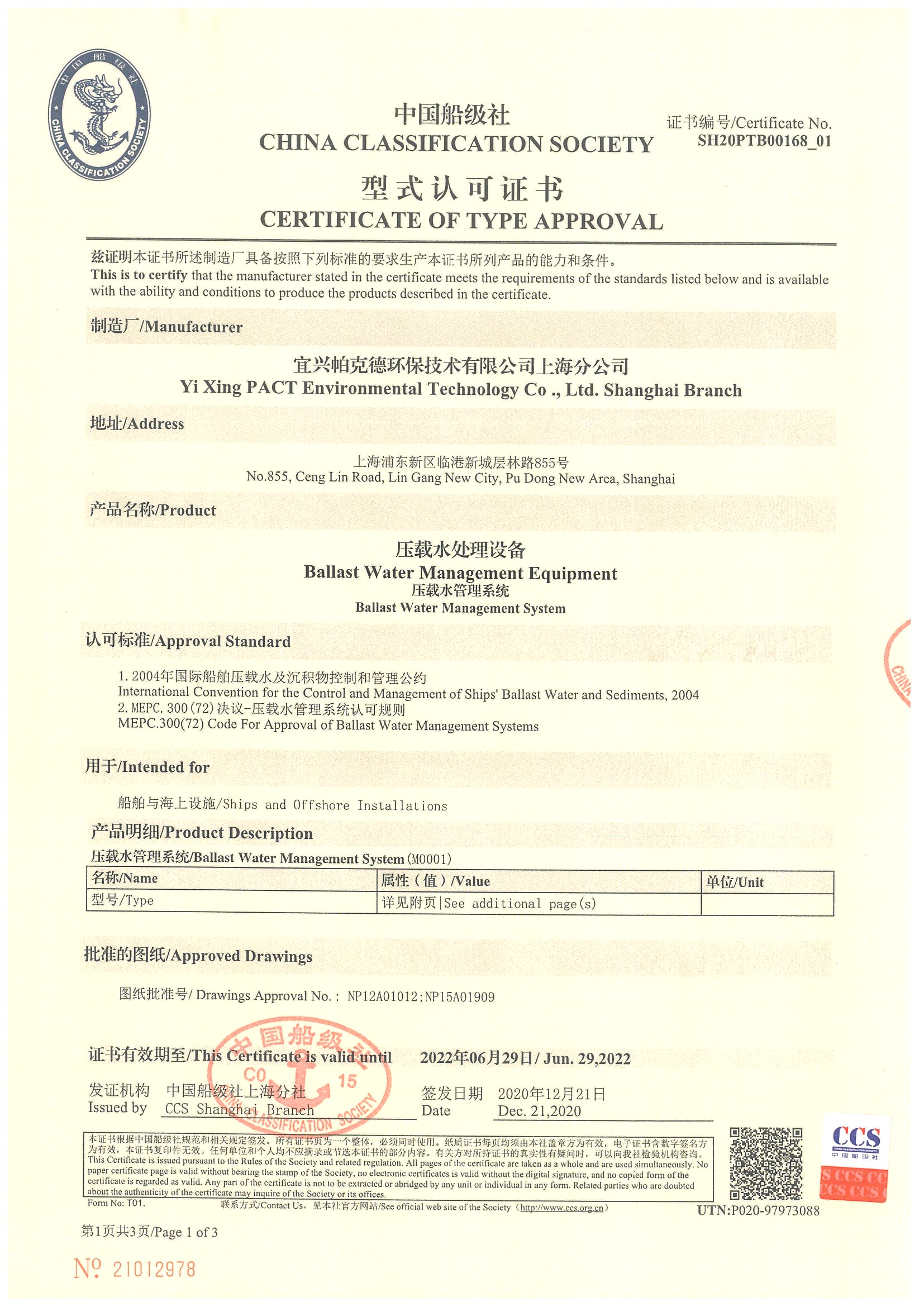 PACT has been awarded the newly revised IMO G8 certificate (MEPC.300(72) resolution) by the China Classification Society. This successful renewal represents that our products and technologies can continue to meet the IMO international Requirements of the Ballast Water Convention.