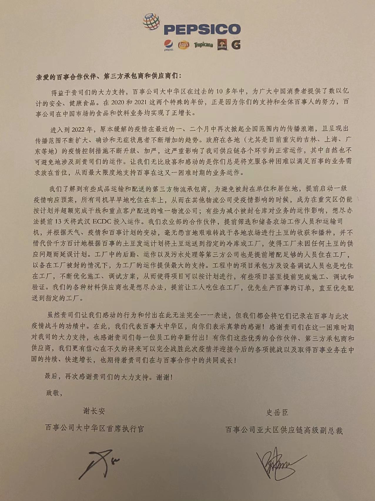 We are deeply honor to receive a special heart warming “appreciation letter” from Pepsico Foods (China) on April 11, 2022 amid under epidemic situation in April.
