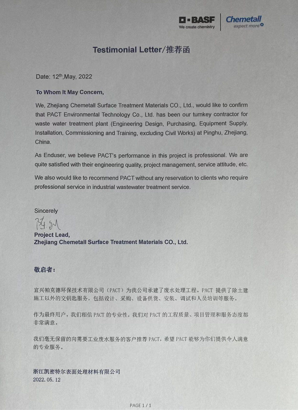 We are delighted to receive BASF ( Chemetall)’s recognition letter regarding our turnkey industrial wastewater solution service.