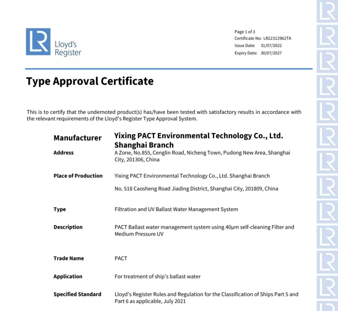 PACT has officially received the type approval certificate ( MEOC.300(72)) from Lloyd’s Register recently regarding our ballast water treatment systems.