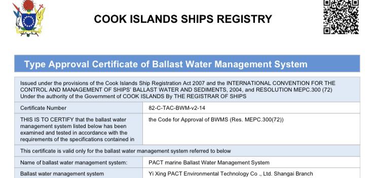 PACT has officially received the type approval certificate ( MEOC.300(72)) from Cook Islands Ships Registry recently regarding our ballast water treatment systems.